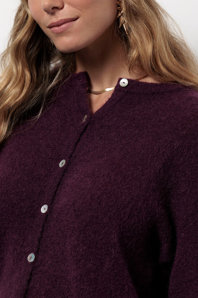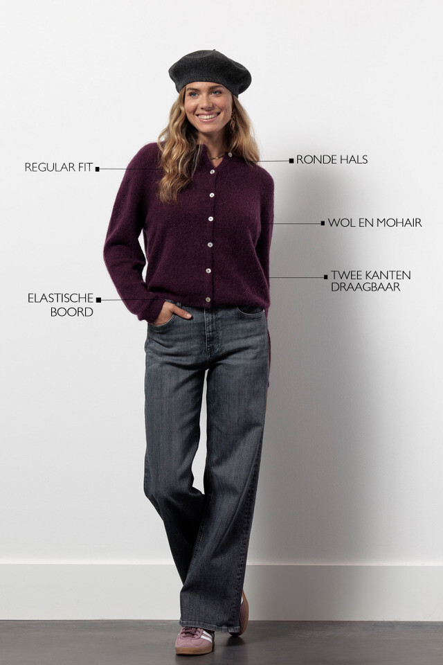 De Bibi mohair cardigan in de kleur Blackberry is een elegant vest met een moderne twist. De diepe paarsrode tint voegt warmte en karakter toe aan je outfit, terwijl de zachte wol- en mohair mix zorgt voor een luxe uitstraling. Dankzij de regular fit draagt het vest comfortabel en valt het losjes om het lichaam.