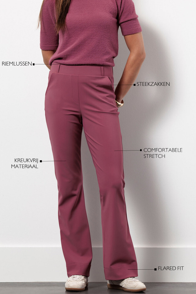 De Flair bonded trousers van Studio Anneloes is de perfecte balans tussen comfort en stijl. Dankzij de flared pijpen, high-waisted fit en de diepe kleur krijgt je outfit direct een krachtige, vrouwelijke uitstraling. De stevige Bonded Travelstof zorgt ervoor dat de pasvorm de hele dag mooi blijft.