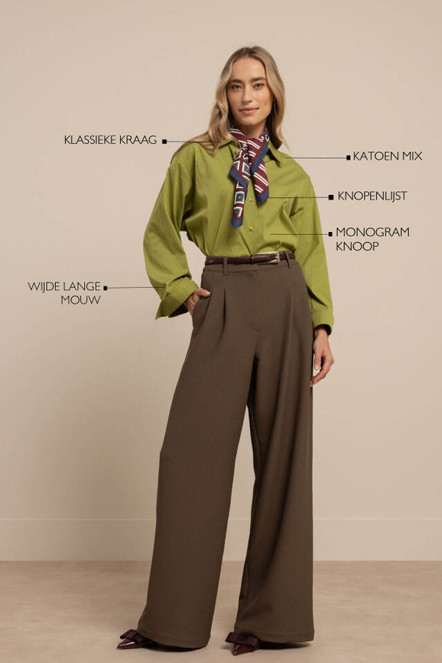 De Erina poplin blouse van Studio Anneloes geeft een klassieke blouse een moderne update. De krachtige kleur Dark Lime in combinatie met de boxy fit en opvallende mouwen zorgt voor een frisse en eigentijdse uitstraling. Perfect voor een stijlvolle workwear look met een twist.