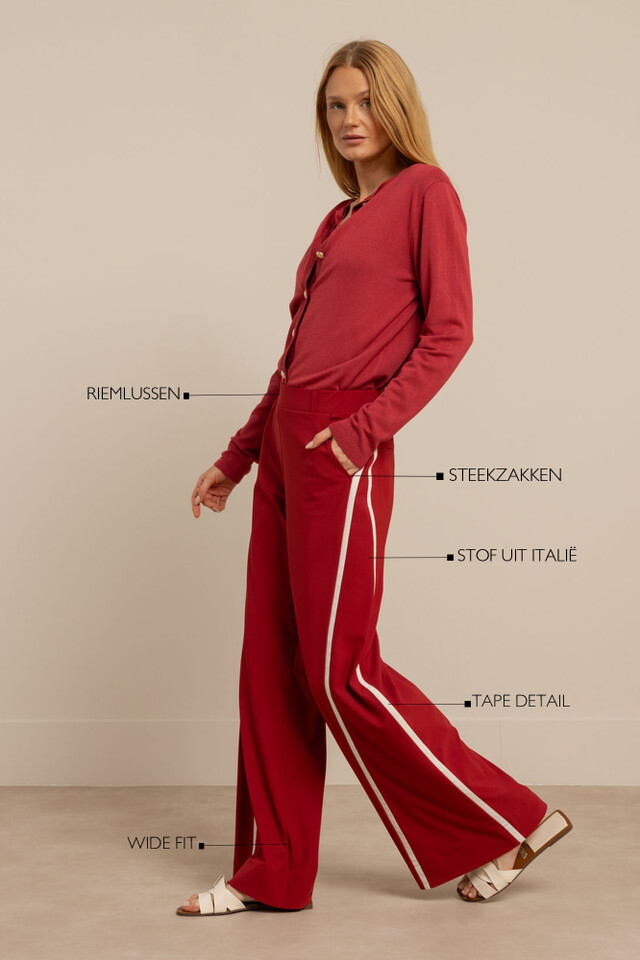 De Levie trousers van Studio Anneloes is een elegante broek met een krachtige uitstraling. De wide fit en de stevige Heavy Travelstof zorgen voor een vloeiend silhouet, terwijl het tape detail het ontwerp een moderne en sportieve touch geeft. In Ruby Red maak je een stijlvol statement.