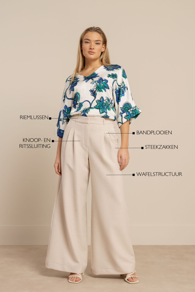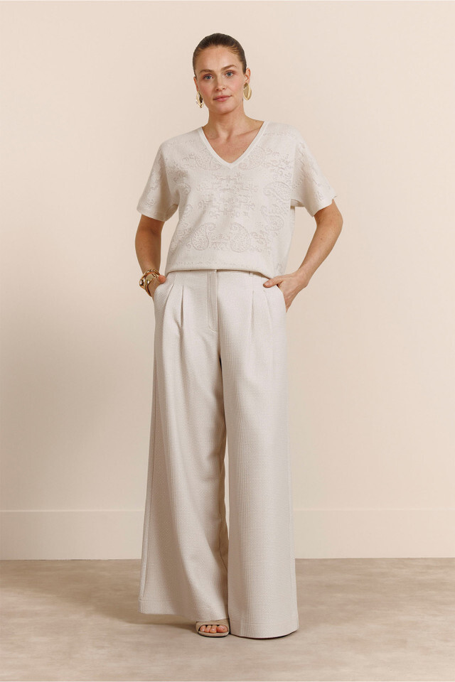 De Sky sparkle waffle trousers van Studio Anneloes is een stijlvolle broek met een subtiele sparkle in de kleuren Kit en Silver. De wide fit en de rijke wafelstructuur geven het item een elegante en moderne uitstraling, terwijl de soepele stof zorgt voor een comfortabele pasvorm.