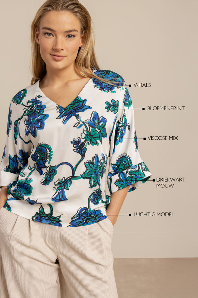 De Madison flower top van Studio Anneloes is een luchtige en vrouwelijke top met een bloemenprint in de kleuren Electric Blue, White en Grass Green. De regular fit en de soepele viscose mix zorgen voor een comfortabele pasvorm, terwijl de V-hals en driekwart mouwen het ontwerp een elegante uitstraling geven.