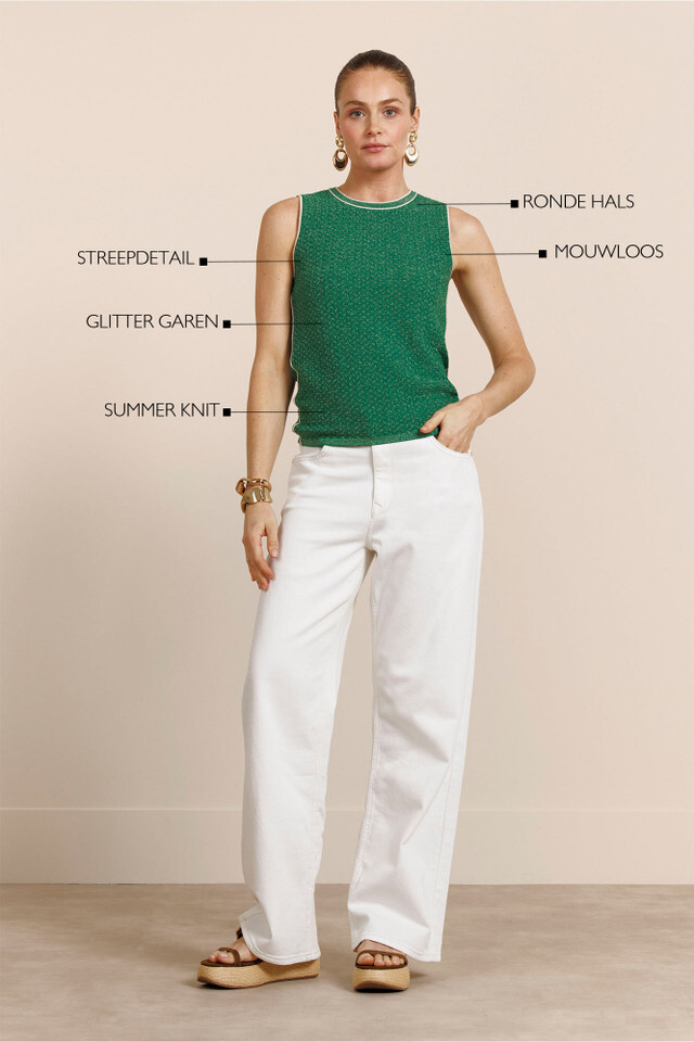 De Novi twinset singlet van Studio Anneloes is een elegante mouwloze top in de kleuren Grass Green en Kit met een verfijnde uitstraling. De regular fit en de Summer Knit zorgen voor een comfortabele en soepele pasvorm, terwijl het streepdessin en het subtiele glittergaren het item een luxe touch geven.