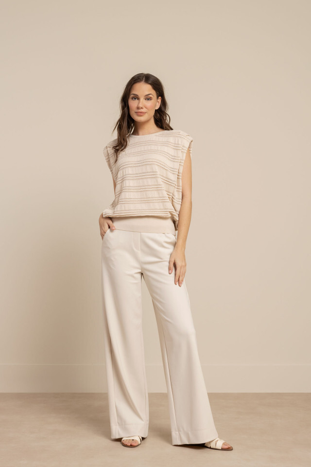 De Leona knitted top van Studio Anneloes is een stijlvolle en moderne top in de zachte kleur Kit. De regular fit en de Summer Knit zorgen voor een comfortabele en luchtige pasvorm, terwijl de schoudervulling en de ronde hals het ontwerp een krachtige en vrouwelijke uitstraling geven.