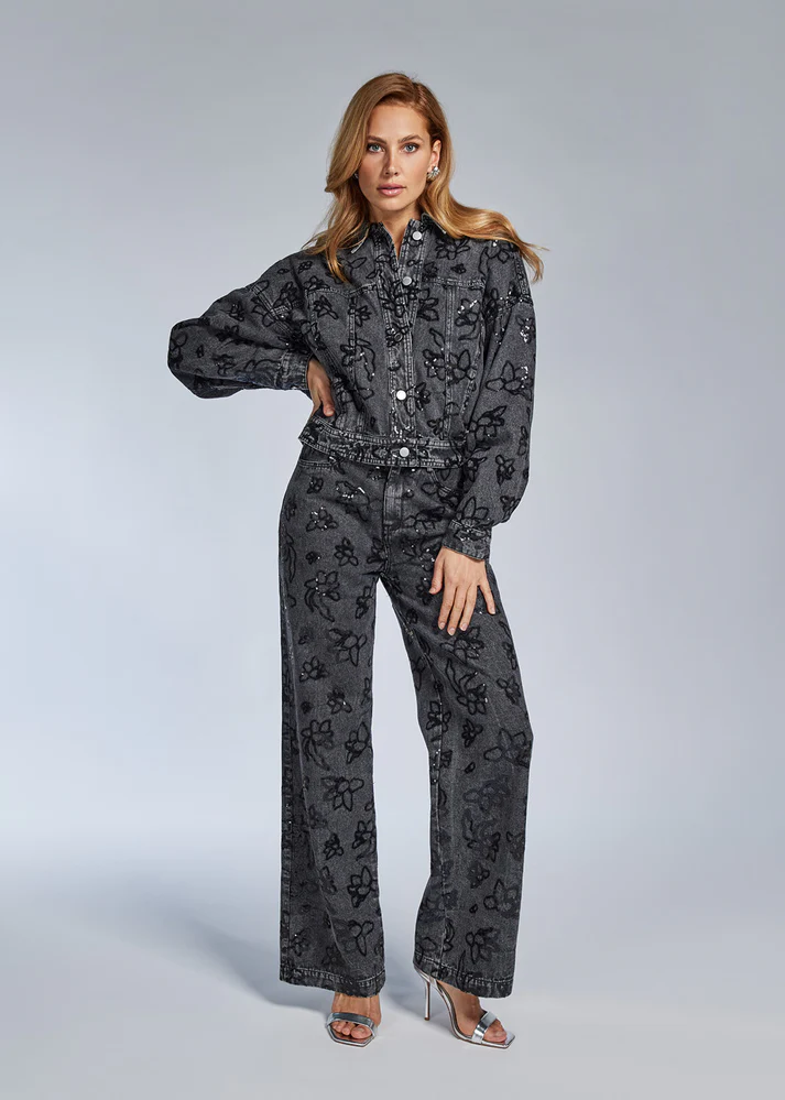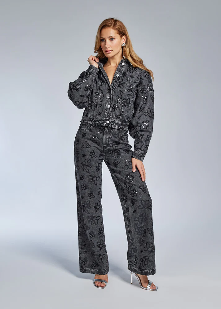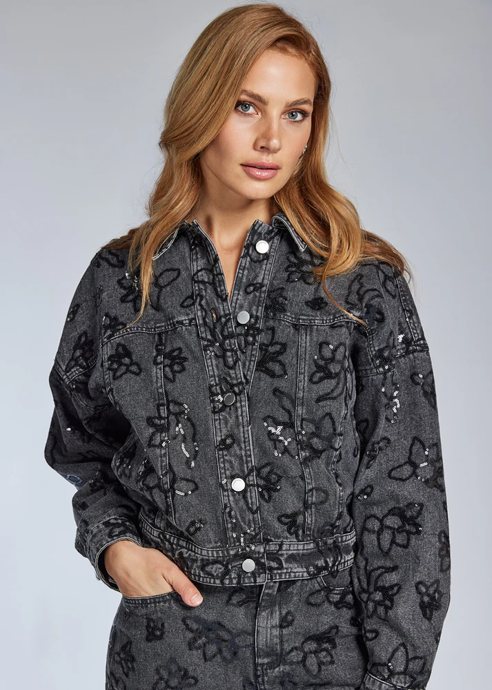 Een opvallend denim jasje met een moderne, glamoureuze twist.Het jasje is gemaakt van een stevige denim kwaliteit en versierd met een subtiel paillettenpatroon dat zorgt voor een stijlvolle glans. De oversized pasvorm geeft het ontwerp een eigentijdse, relaxte look, terwijl de knoopsluiting aan de voorkant zorgt voor een klassieke afwerking. Perfect om een casual outfit een chique en speelse upgrade te geven.