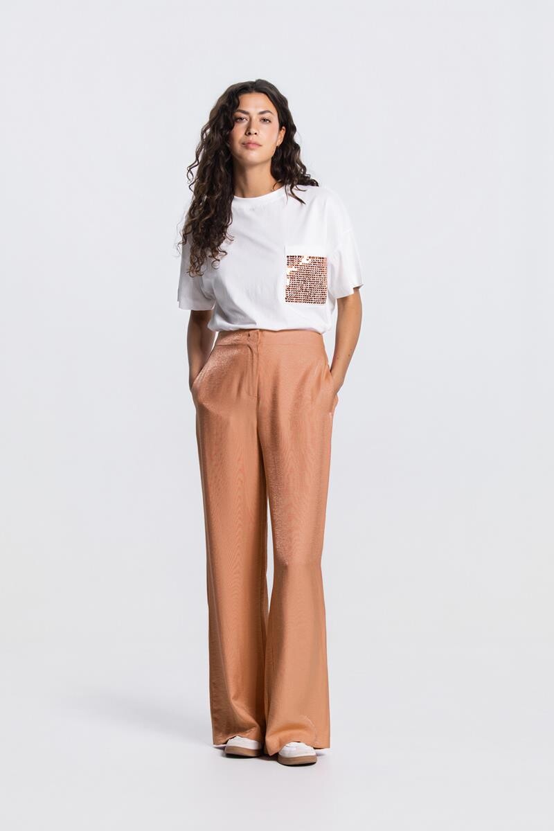 De Pam pantalon in donkerperzik is een wide leg model van soepel vallende glansstof. Voorzien van steekzakken, paspelzakken op de achterzijde en een elastische taille aan de achterzijde voor extra draagcomfort. Afgewerkt met rits en gulp aan de voorzijde.