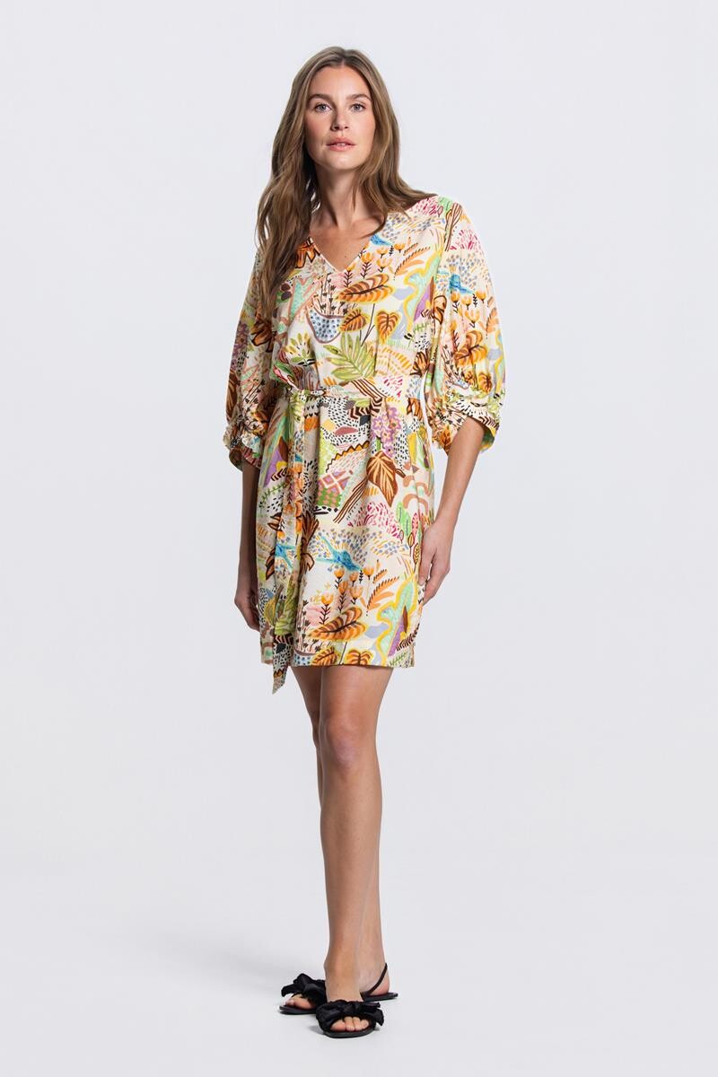 De Vandy midi jurk in multicolor is een elegante jurk met V-hals en driekwart mouwen. De jurk heeft een midi lengte, een bijpassend ceintuur en een all-over zomerse print. Perfect voor een vrouwelijke en casual-chic uitstraling.