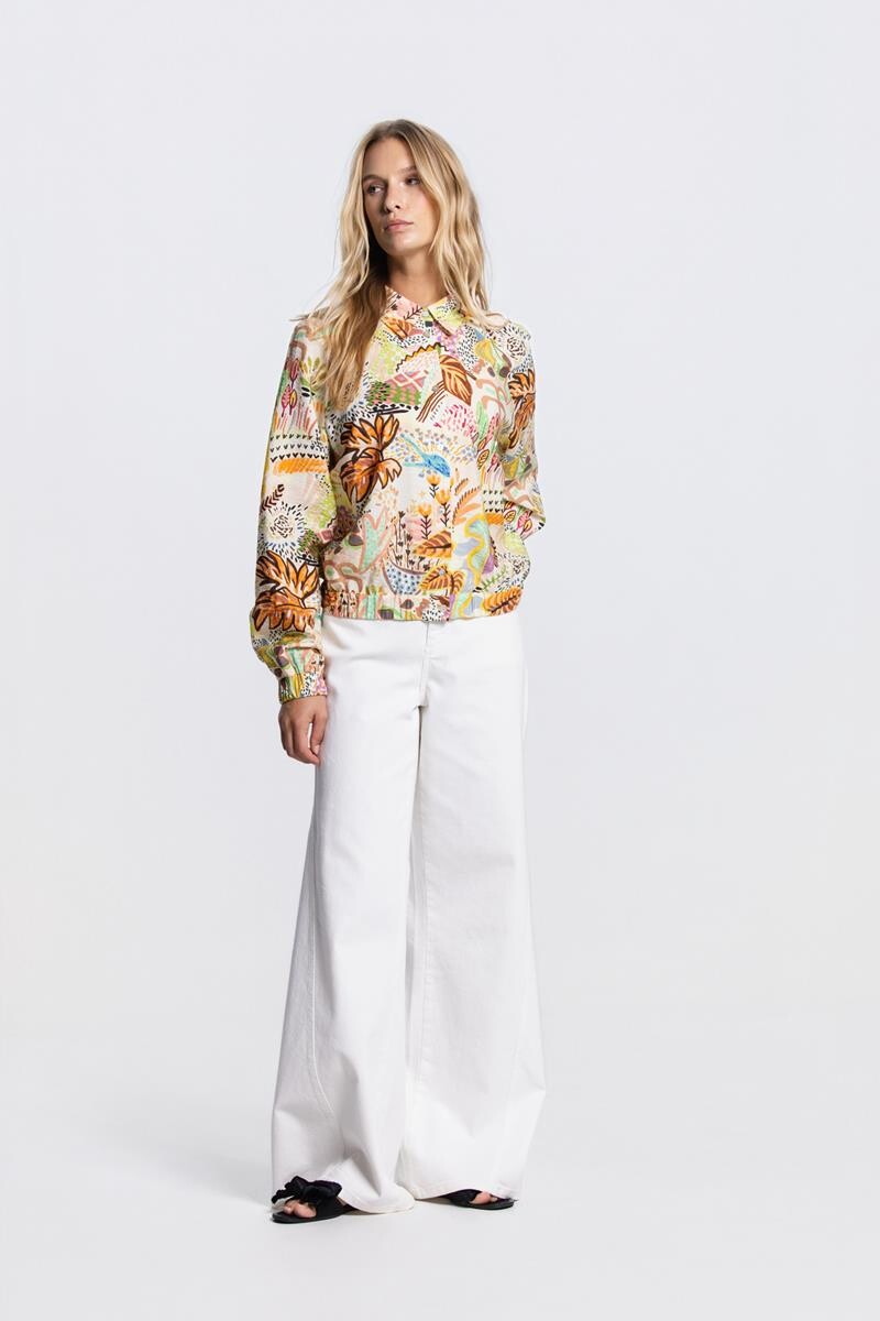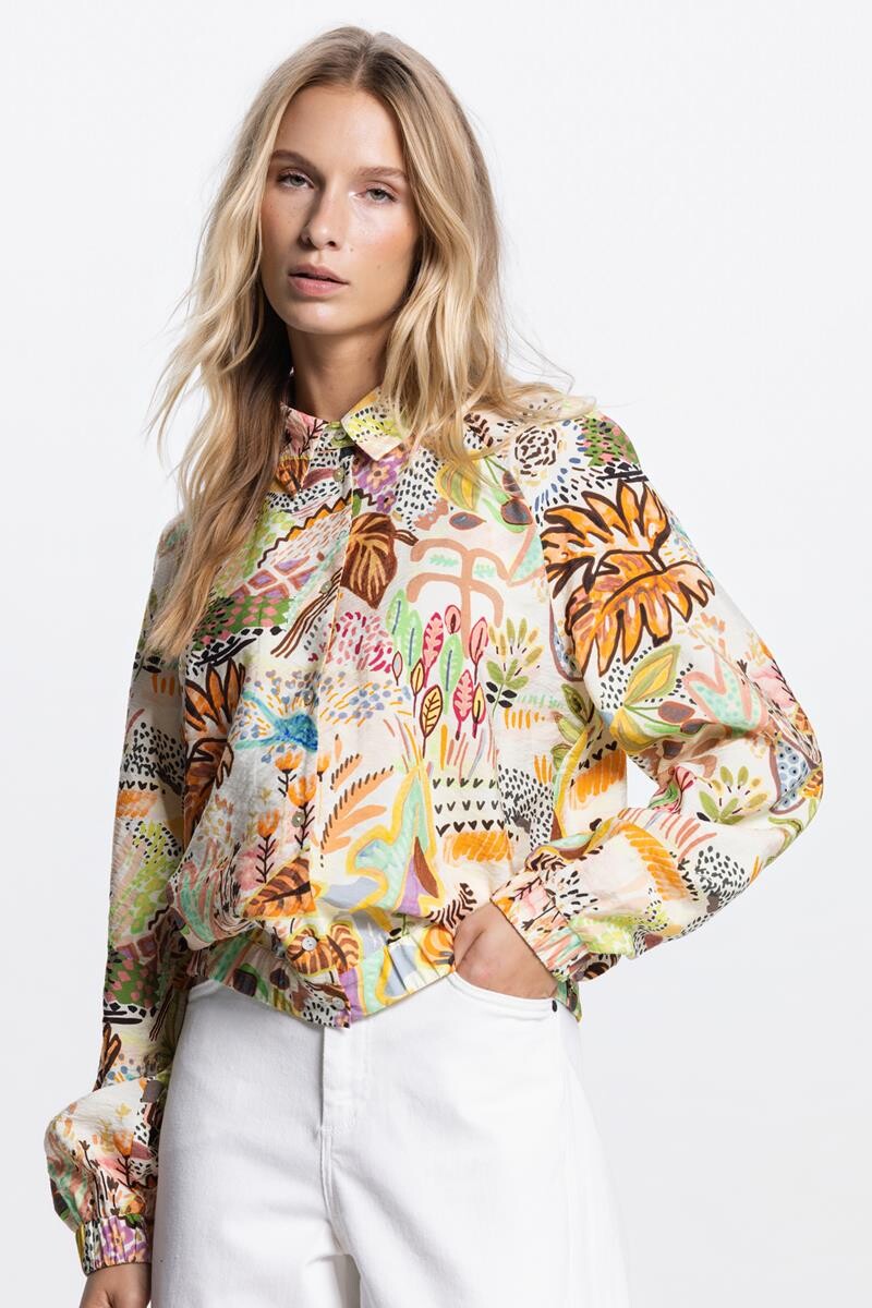 De Vanna blouse in multicolor is een bomber model blouse van gecombineerde materialen. Voorzien van een elastiek aan de onderzijde voor een blouson-effect, een doorknoopsluiting en een klassieke kraag. Comfortabel, stijlvol en geschikt voor een casual-chic look.